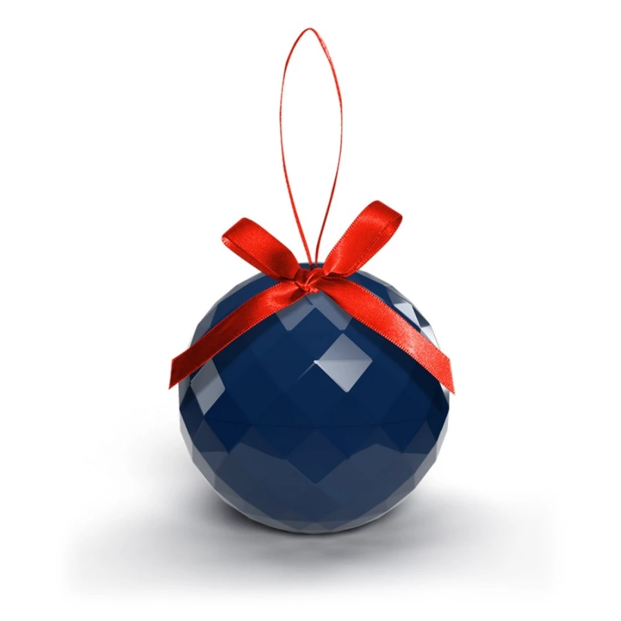 Kula upominkowa, rozkładany pojemnik na upominki reklamowe (wyprodukowana w Europie / made in Europe). Unikalny design powierzchni z geometrycznym motywem efektownie odbija światło, płaska podstawa ułatwia postawienie produktu. Otwór w górnej części umożliwia zamocowanie zawieszki, ozdobnego sznurka lub metki (nie dołączono). Możliwość dodania ozdobnej czerwonej wstążki (wstążka V0011-05 sprzedawana osobno). Kula świetnie sprawdzi się jako bombka na choinkę, pojemnik na kosmetyki, słodycze, owoce, drobiazgi. Zgodna z przepisami dla produktów przeznaczonych do kontaktu z żywnością, wzór zastrzeżony®