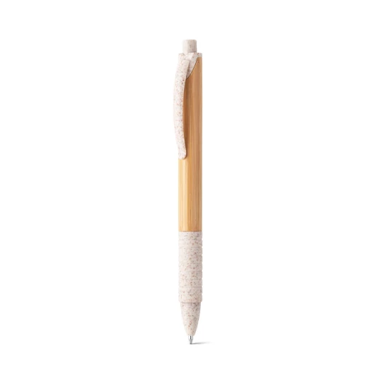 Bambusowy długopis z antypoślizgowym uchwytem, klipsem i kolorowymi elementami z włókna pszenicznego i ABS. Niebieski tusz. Ponieważ produkt jest wykonany z naturalnych materiałów, kolor produktu oraz wynik drukowania mogą się różnić w zależności od produktu. ø11 x 142 mm