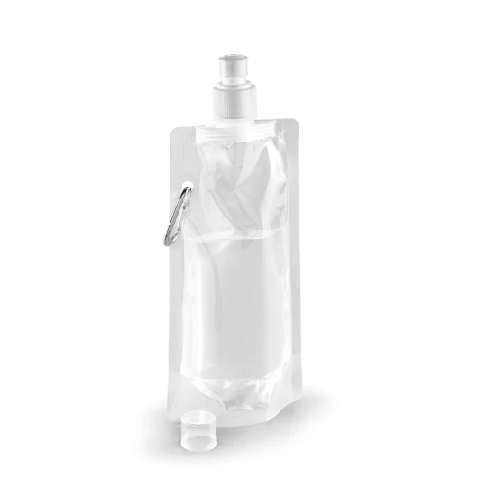 Składana butelka PE z nakrętką typu push-pull. Zawiera przezroczystą nasadkę i karabińczyk. Pojemność do 460 mL. 120 x 260 x 30 mm