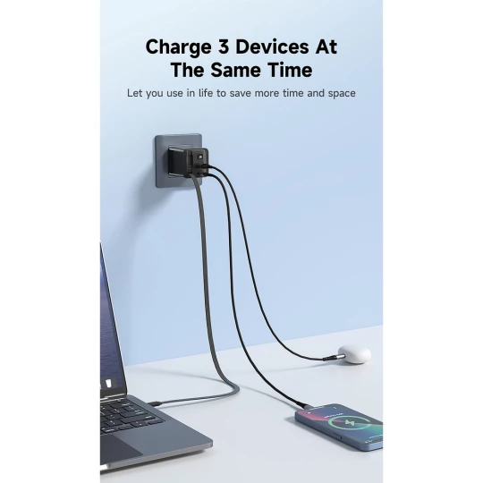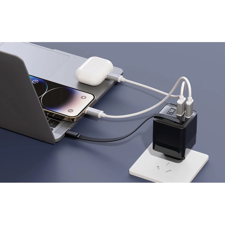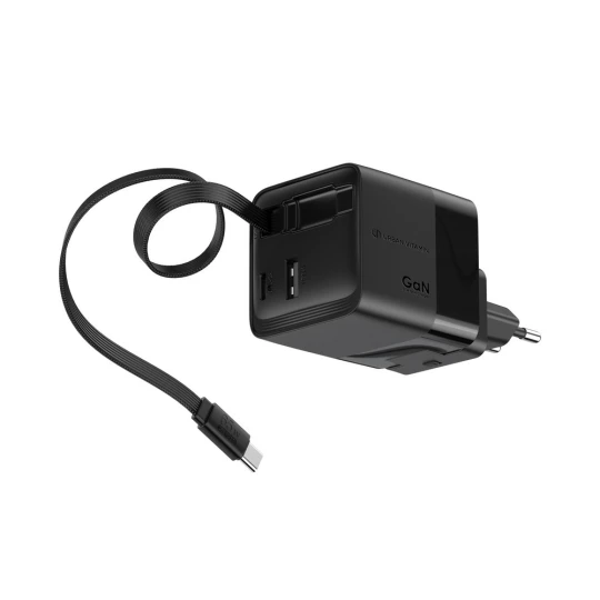 Ładowarka ścienna 65W, adapter podróżny, dzięki dużej mocy ładowania do 65W ładowarka nadaje się do ładowania laptopów, zintegrowany, zwijany kabel USB-C o długości 80 cm, wyjścia USB-C i USB A, całkowita zawartość materiałów z recyklingu obliczona na podstawie wagi całkowitej przedmiotu: 18%, kabel w komplecie