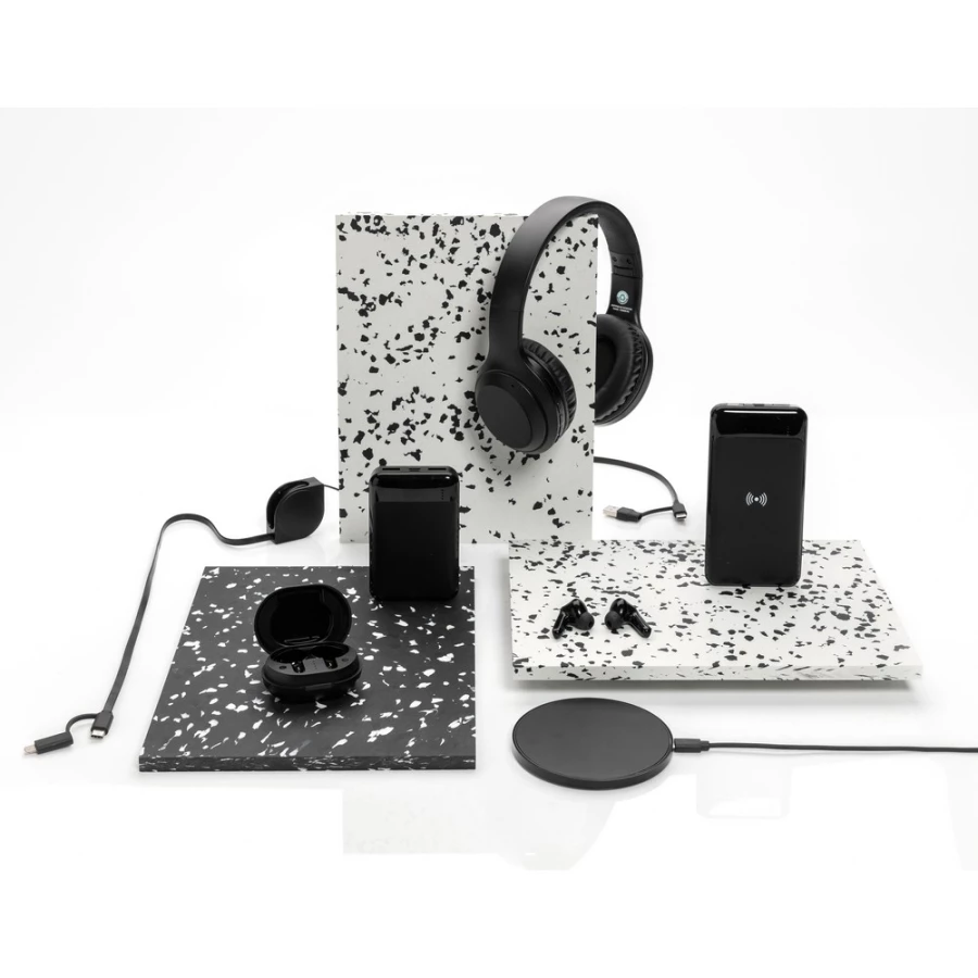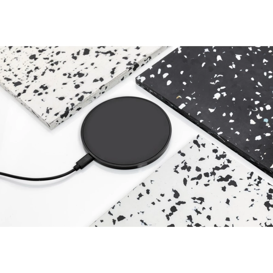 Ładowarka bezprzewodowa 10W, obudowa wykonana z ABS pochodzącego z recyklingu, posiadają certyfikat RCS (Recycled Claim Standard), który jest stosowany gdy produkt jest wykonany częściowo lub w całości z materiałów pochodzących z recyklingu, bezprzewodowe ładowanie jest kompatybilne ze wszystkimi urządzeniami posiadającymi możliwość ładowania indukcyjnego, wejście 9V/1.5A, wyjście bezprzewodowe 9V/1.1A, 10W, w komplecie kabel o długości 150 cm z podwójnym złączem (USB A i USB C), nie zawiera PVC, ślad węglowy produktu: 0,98 kg CO2