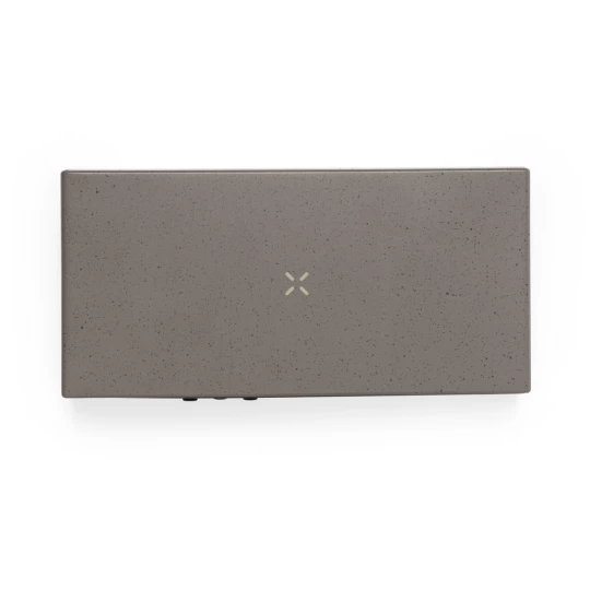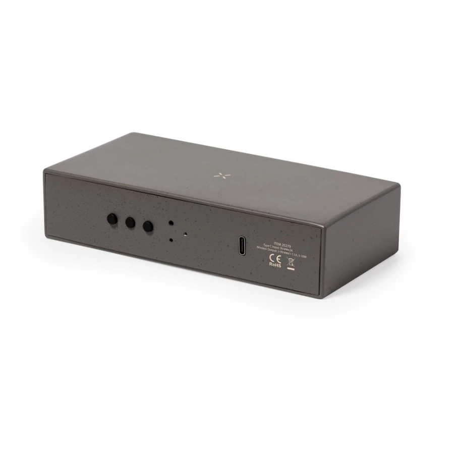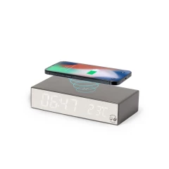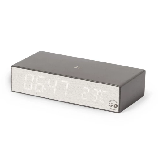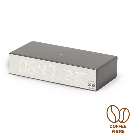 Ładowarka bezprzewodowa 10W, wbudowany zegar cyfrowy, funkcje: alarm, temperatura, zegar i data, obudowa wykonana z łusek kawowych i bawełny z recyklingu, działa z urządzeniami posiadającymi możliwość ładowania indukcyjnego, zgodny z certyfikatem GRS (Global Recycled Standard)