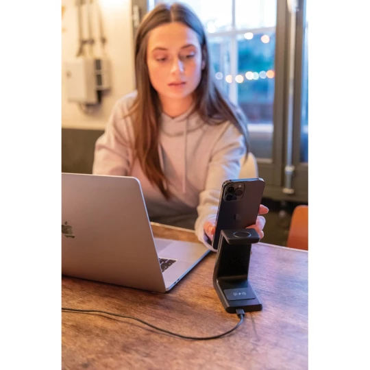 Bezprzewodowa podstawka ładująca 15W wykonana z ABS z recyklingu, zawartość materiałów z recyklingu obliczona na podstawie wagi całkowitej przedmiotu: 65%, bezprzewodowa ładowarka dual coil 15, bezprzewodowa ładowarka 5W z tyłu i ładowarka 3W, 120 cm kabel USB typu C z TPE z recyklingu z certyfikatem RCS w komplecie, opakowanie o zmniejszonej zawartości plastiku, produkt nie zawiera PVC, ślad węglowy produktu: 1,71 kg CO2