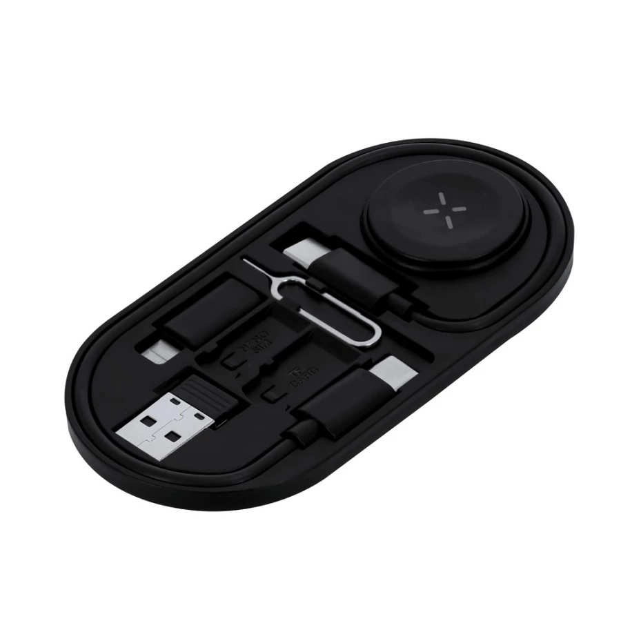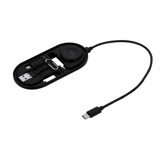 Magnetyczna ładowarka bezprzewodowa 15W, działa z urządzeniami posiadającymi możliwość ładowania indukcyjnego, funkcja magnetyczna działa tylko z kompatybilnymi urządzeniami, kabel do ładowania i synchronizacji z 2 końcówkami USB-C, w komplecie 3 adaptery z wejściami USB-C i końcówkami: micro USB, USB oraz końcówką kompatybilną z urządzeniami iOS, wejście/wyjście USB-C 5V/1A, narzędzie do wyciągania karty SIM oraz etui w komplecie, produkt wykonany z RABS, zgodny z certyfikatem RCS (Recycled Claim Standard)