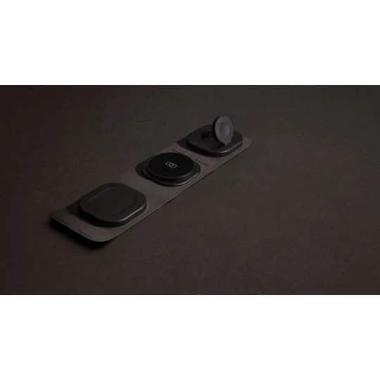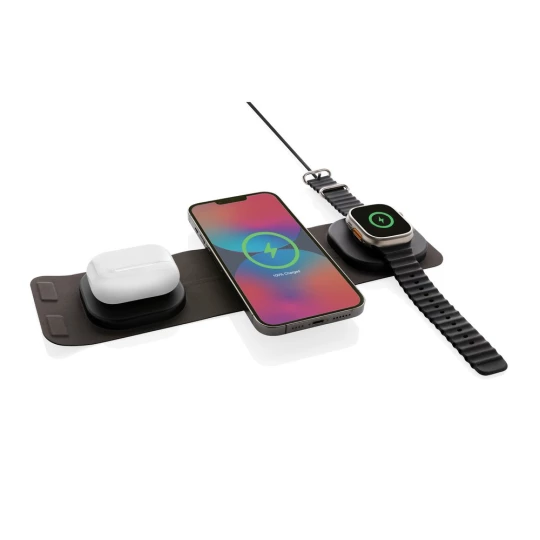 Ładowarka bezprzewodowa 3 w 1, magnetyczna ładowarka bezprzewodowa do telefonu 15W, ładowarka bezprzewodowa 5W do słuchawek i innej drobnej elektroniki, ładowarka bezprzewodowa 2,5W do smartwatcha (działa tylko z urządzeniami iOS), składana, działa z telefonami posiadającymi możliwość ładowania indukcyjnego, wykonana z ABS z recyklingu z certyfikatem RCS, całkowita zawartość materiałów z recyklingu obliczona w oparciu o wagę całkowitą przedmiotu: 38%, wejście 9V/1.1A, wyjścia: 9V/1.1A, 5V/1A, 5V/0.5A, w pudełku z papieru kraftowego