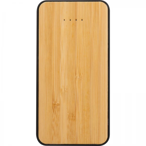 Bezprzewodowa ładowarka i power bank w jedym. Ładowarka posiada drewnianą obudowę, baterię o pojemności 8000 mAh, moc 5 wat, wyjście USB i typu C. W zestawie kabelek do ładowania.