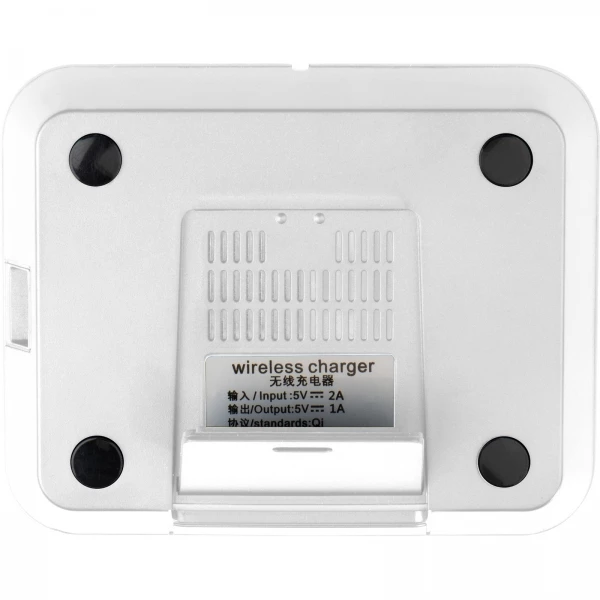 Ładowarka indukcyjna (QI standard) z plastiku. Może służyć także jako stojak na telefon. Kabel micro USB w zestawie. Moc wejściowa: 5V/2A, moc wyjściowa 5V/1A.
