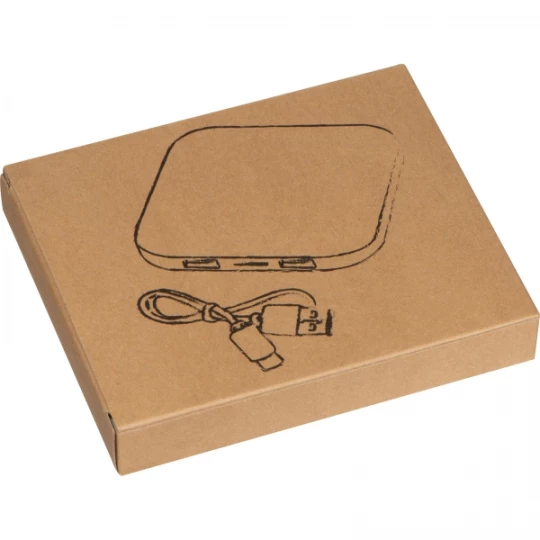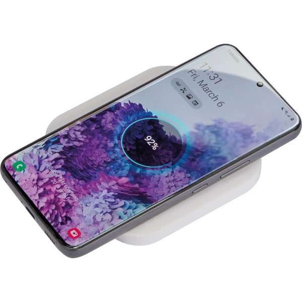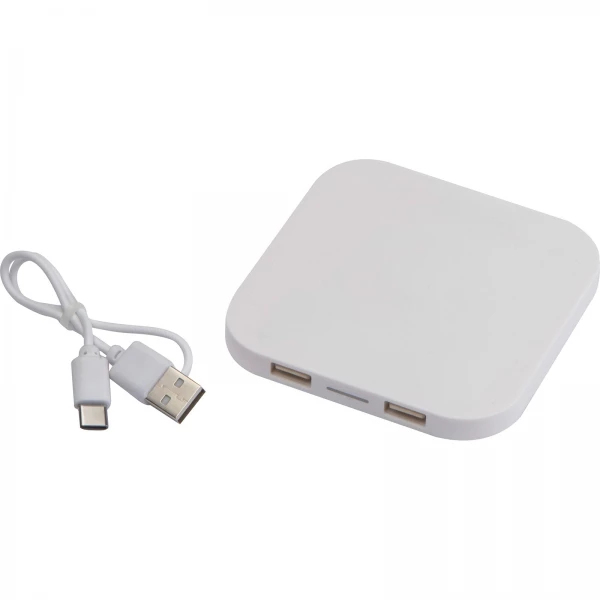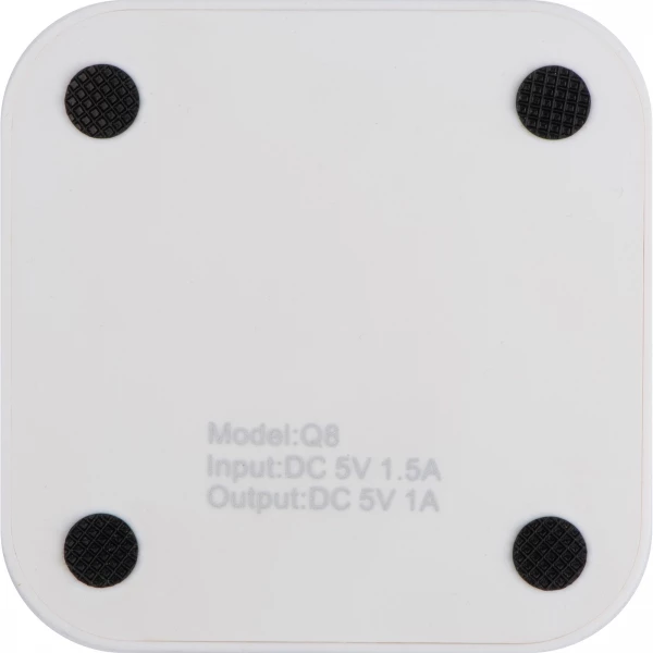 Ładowarka indukcyjna, kompatybilna z telefonami wyposażonymi w technologię QI. Posiada 2 wejścia USB, dołączono kabel USB.