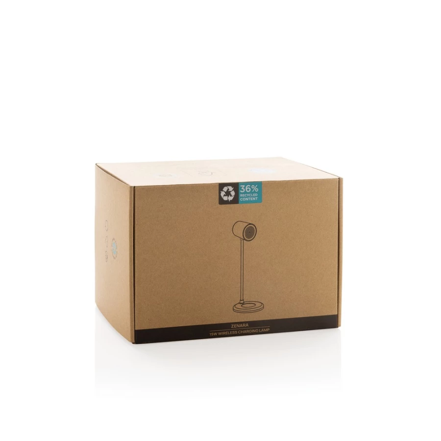 Lampka na biurko, ładowarka bezprzewodowa 15W, jasność 55 lumenów, 3 tryby świecenia, wykonana z ABS z recyklingu z certyfikatem RCS i korka z certyfikatem FCS®, działa z telefonami posiadającymi możliwość ładowania indukcyjnego, wejście USB C 5V/2A, 9V/2A, 12V/1.5A, wyjście 5V/1A, 9V/1.1A, 9V/1.67A, 15W, kabel 120 cm z TPE z recyklingu w komplecie, całkowita zawartość materiałów z recyklingu obliczona w oparciu o wagę całkowitą przedmiotu: 36%, w pudełku z certyfikatem FSC® mix
