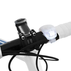 Lampka rowerowa, 2 diody LED (-02 diody białe, -05 diody czerwone), posiada przycisk ON/OFF oraz 3 tryby świecenia: światło stałe, światło migające szybko oraz światło migające powoli, produkt wykonany z silikonu i plastiku