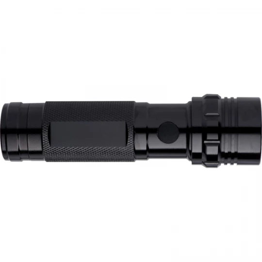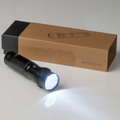 Metalowa latarka z 14 żarówkami LED. Dostarczana w kartonowym pudełku razem z bateriami 3xAAA.