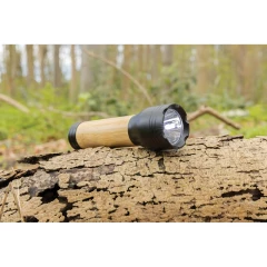 Latarka 1W, zasięg do 50 m, jasność 90 lm, 3 tryby świecenia, wbudowany akumulator o pojemności 500 mAh pozwala na świecenie do 3 godzin, ponowne naładowanie w 2,5 godziny, wykonana z ABS z recyklingu z certyfikatem RCS oraz bambusa z certyfikatem FSC®, całkowita zawartość materiałów z recyklingu obliczona na podstawie wagi całkowitej przedmiotu: 23%, wejście USB C, kabel z TPE z recyklingu z certyfikatem RCS w komplecie, w pudełku z papieru kraftowego z certyfikatem FSC® mix, ślad węglowy produktu: 0,83 kg CO2