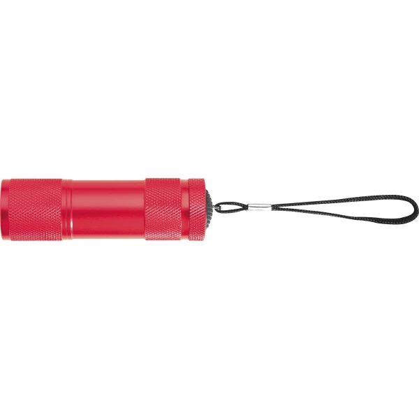 Latarka z 9 diodami LED dającymi bardzo jasne światło. Wykonana z aluminium i zapakowana wraz z trzema bateriami w kartonik.