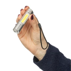 Latarka COB, 3 tryby świecenia, 80-100 lumenów, opaska na nadgarstek, ikona recyklingu na produkcie, funkcja ładowania, port USB-C, bateria 300 mAh, czarny kabel 30 cm w komplecie, zapakowana pojedynczo w brązowy kartonik, produkt wykonany z aluminium z recyklingu i poliestru
