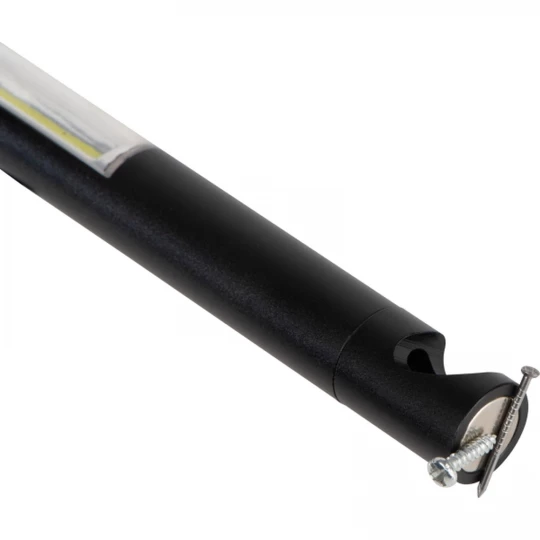 Aluminiowa latarka z żarówką LED COB z otwieraczem do butelek, klipsem i magnetyczną podstawką. Produkt zawiera baterie.