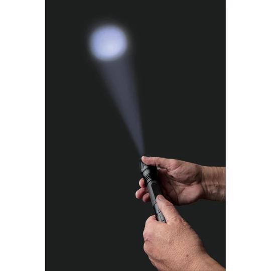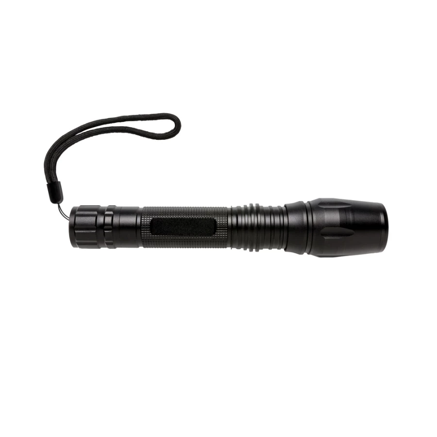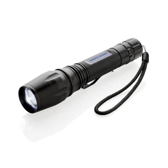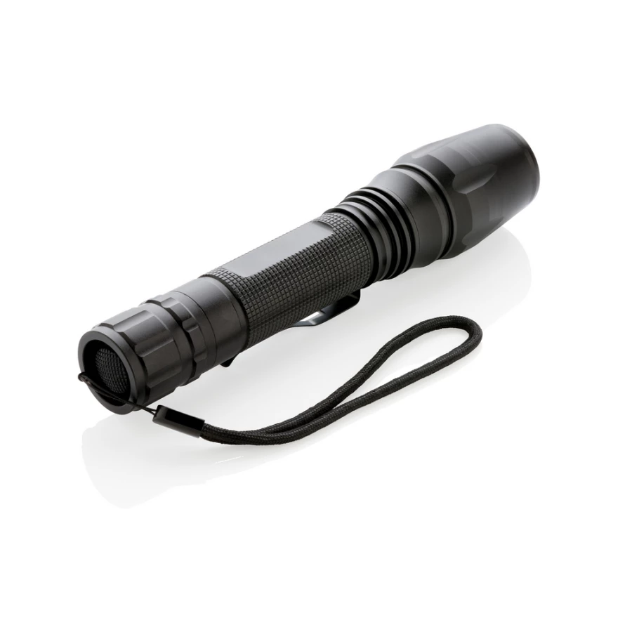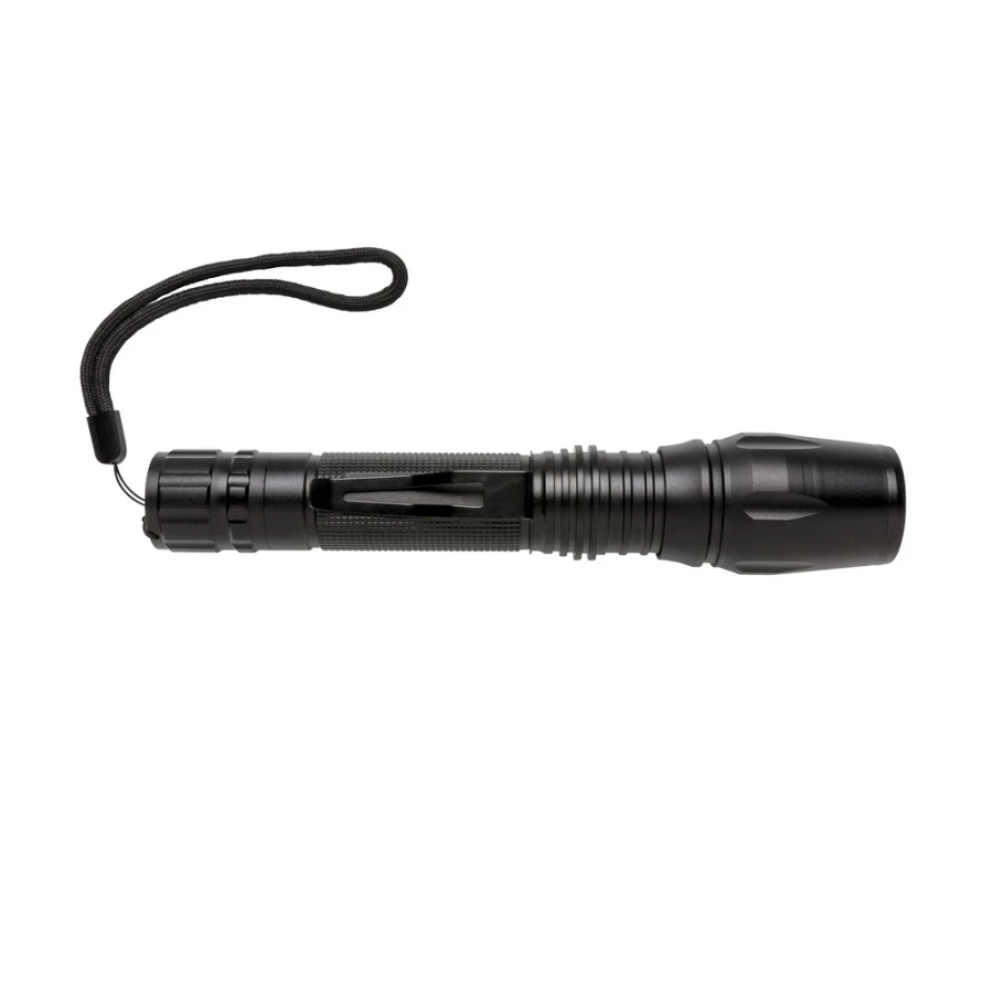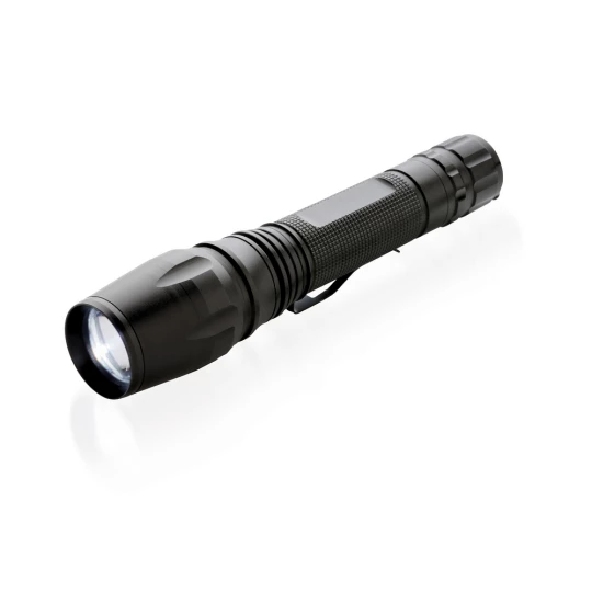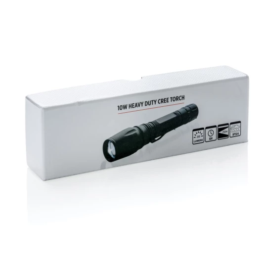 Latarka CREE LED 10W o bardzo jasnym świetle, wykonana z aluminium, 250 lumenów, wytrzymała, wodoodporna IPX4 (całkowita ochrona przed spryskiwaniem i zachlapaniem wodą z różnych kierunków z natężeniem do 10 litrów na minutę) i wstrząsoodporna (upuszczenie nawet z 1 metra), funkcja zoom, klip do paska, czas pracy do 6 godzin, baterie w komplecie, ślad węglowy produktu: 2,56 kg CO2