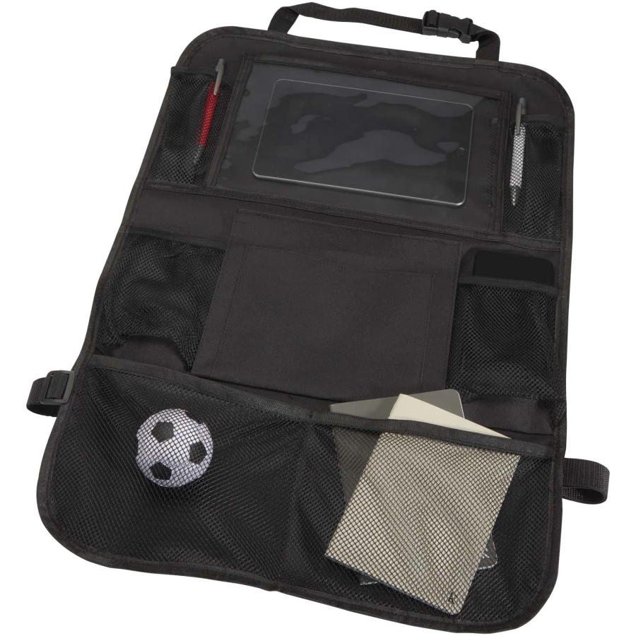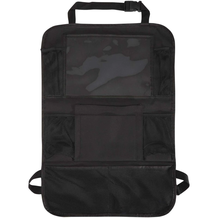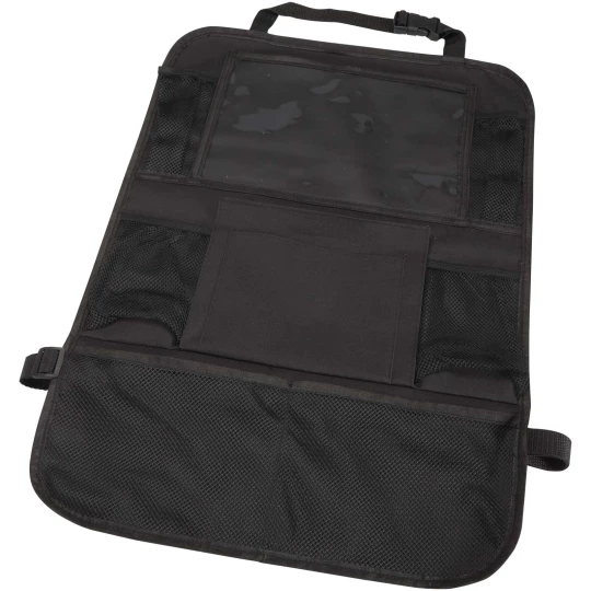 Organizer na tylne siedzenie samochodu z wieloma siatkowymi kieszeniami do przechowywania niezbędnych przedmiotów, takich jak przekąski, zabawki lub butelki, a także z okienkiem z PVC na tablet. Łatwy do zamocowania do przedniego siedzenia. Pomaga utrzymać porządek w samochodzie. Idealny dla rodzin, podczas podróży lub do codziennego użytku.