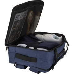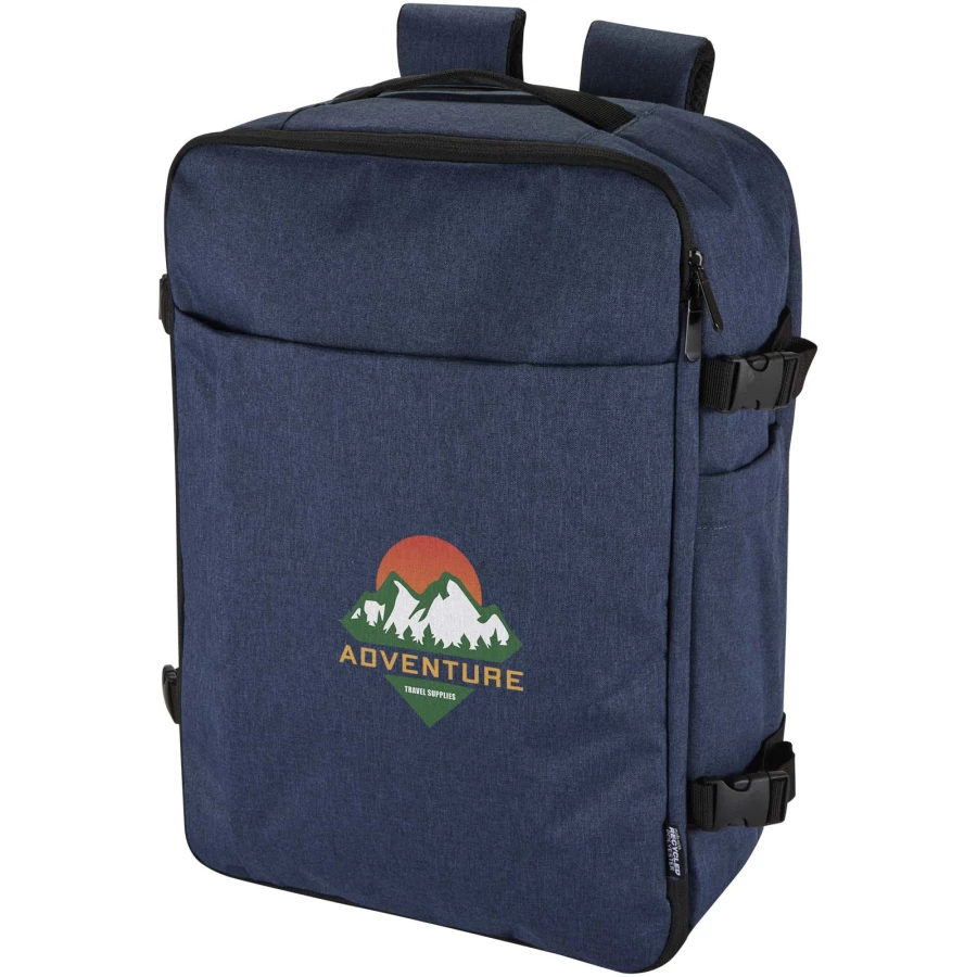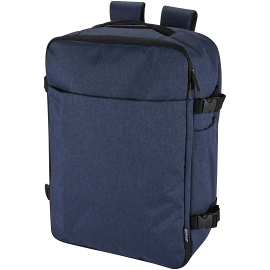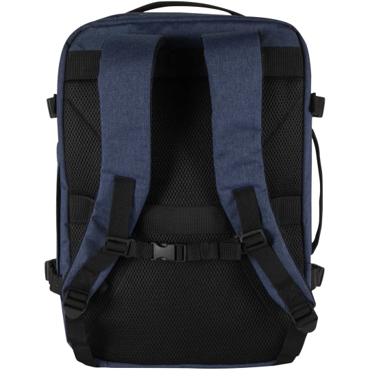 Plecak podręczny Libra o długości 43 cm wykonany jest z poliestru z recyklingu z certyfikatem GRS, z podszewką z tworzywa RPET. Został on zaprojektowany tak, aby spełniać wymagania linii lotniczych dotyczące bagażu podręcznego. Dzięki temu będzie idealnym towarzyszem w podróży. Ma specjalną przegrodę na laptopa o przekątnej do 17 cali, przestronną komorę główną z elastycznymi paskami i przegrodami siatkowymi zapewniającymi bezpieczeństwo i porządek przechowywanych rzeczy, a także dwie duże przednie kieszenie zapinane na zamek, zapewniające łatwy dostęp do najpotrzebniejszych rzeczy. Dla zapewnienia komfortu i wygody plecak wyposażono w przewiewny tylny panel, pasek na bagaż, regulowane paski na ramiona z paskiem poprzecznym na klatkę piersiową oraz uchwyty górne i boczne, które umożliwiają wszechstronne wykorzystanie. Ten plecak, idealny na podróże służbowe, pracę zdalną lub weekendowe wyjazdy, łączy w sobie elegancki design z praktyczną funkcjonalnością, sprawdzającą się w życiu w ciągłym ruchu.