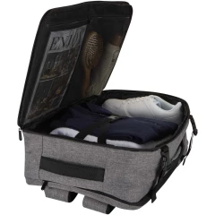 Plecak podręczny Libra o długości 43 cm wykonany jest z poliestru z recyklingu z certyfikatem GRS, z podszewką z tworzywa RPET. Został on zaprojektowany tak, aby spełniać wymagania linii lotniczych dotyczące bagażu podręcznego. Dzięki temu będzie idealnym towarzyszem w podróży. Ma specjalną przegrodę na laptopa o przekątnej do 17 cali, przestronną komorę główną z elastycznymi paskami i przegrodami siatkowymi zapewniającymi bezpieczeństwo i porządek przechowywanych rzeczy, a także dwie duże przednie kieszenie zapinane na zamek, zapewniające łatwy dostęp do najpotrzebniejszych rzeczy. Dla zapewnienia komfortu i wygody plecak wyposażono w przewiewny tylny panel, pasek na bagaż, regulowane paski na ramiona z paskiem poprzecznym na klatkę piersiową oraz uchwyty górne i boczne, które umożliwiają wszechstronne wykorzystanie. Ten plecak, idealny na podróże służbowe, pracę zdalną lub weekendowe wyjazdy, łączy w sobie elegancki design z praktyczną funkcjonalnością, sprawdzającą się w życiu w ciągłym ruchu.