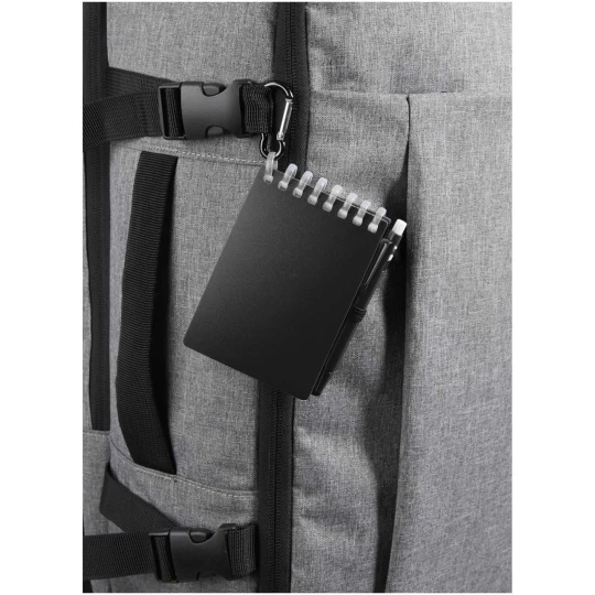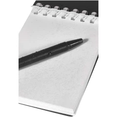 Lig zestaw mini notatnika oraz długopisu to kompaktowe i praktyczne rozwiązanie do robienia notatek w podróży. Notatnik w oprawie spiralnej ma miękką okładkę z recyklingowanego plastiku i 70 czystych kartek z papieru kamiennego o gramaturze 120 g/m², odpornego na działanie wody, dzięki czemu idealnie nadaje się do użytku na zewnątrz. Dzięki zaokrąglonym narożnikom i wbudowanej pętelce na długopis wpisuje się w trend miniaturyzacji, zachowując jednocześnie funkcjonalność. Dopasowany długopis jest wykonany z plastiku ABS z recyklingu, ma czarny tusz i oferuje długość pisania 250 metrów. Metalowy pierścień w dopasowanym kolorze umożliwia łatwe przymocowanie zestawu do plecaka, torebki lub łańcucha do kluczy, dzięki czemu idealnie nadaje się do sporządzania trwałych notatek w dowolnym miejscu. Rozmiar notatnika: 11 x 7,5 cm.