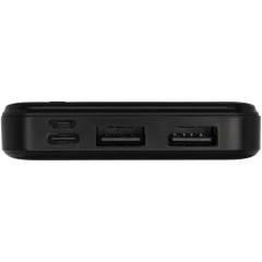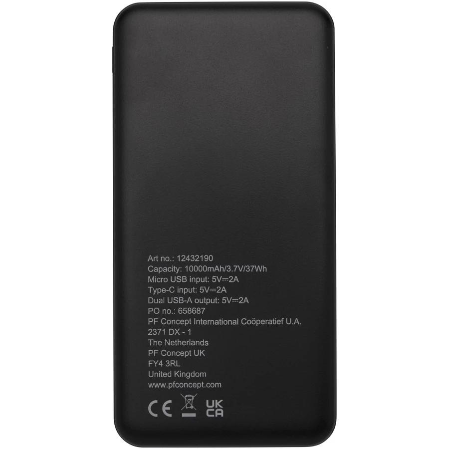 Powerbank wykonany z plastiku ABS pochodzącego z recyklingu. Powerbank zawiera wytrzymałą baterię litowo-polimerową klasy A o pojemności 10 000 mAh, która zapewnia szybkie ładowanie. Wskaźniki zasilania wskazują pozostały poziom energii, dzięki czemu zawsze wiesz, kiedy należy naładować urządzenie. Wejście typu C 5 V/2 A, wejście Micro USB 5 V/2 A, podwójne wyjście USB-A 5 V/2 A, całkowita moc 10 W. Dostarczany z 30-centymetrowym kablem ładującym TPE 2A USB-A do USB typu C, instrukcją obsługi i pudełkiem upominkowym z papieru Kraft.