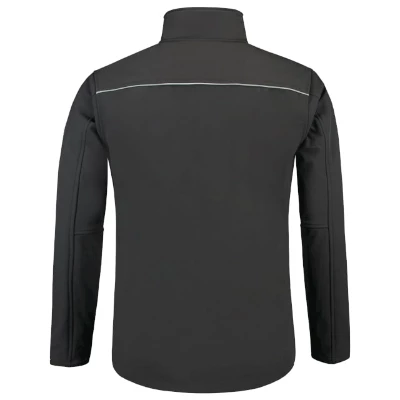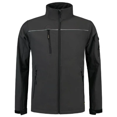 3-warstwowy softshell z membraną, wodoodporny, wiatroodporny i oddychający materiał, prosty krój ze szwami bocznymi, zamek błyskawiczny z odwróconym suwakiem na całej długości z ochroną podbródka, regulowane obszycia rękawów za pomocą rzepu, dolny brzeg regulowany za pomocą elastycznego ściągacza, kieszenie z odwróconym spiralnym zamkiem błyskawicznym, kieszeń na piersi, kieszeń na rękawie, elementy odblaskowe, Tricorp kod produktu: 402006