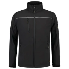 3-warstwowy softshell z membraną, wodoodporny, wiatroodporny i oddychający materiał, prosty krój ze szwami bocznymi, zamek błyskawiczny z odwróconym suwakiem na całej długości z ochroną podbródka, regulowane obszycia rękawów za pomocą rzepu, dolny brzeg regulowany za pomocą elastycznego ściągacza, kieszenie z odwróconym spiralnym zamkiem błyskawicznym, kieszeń na piersi, kieszeń na rękawie, elementy odblaskowe, Tricorp kod produktu: 402006