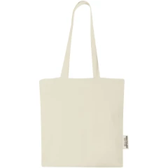 Torba na zakupy Madras wykonana w 100% z bawełny z recyklingu z certyfikatem GRS idealnie nadaje się do rozdawania podczas dowolnej imprezy czy konferencji lub do zakupów lub drobnych artykułów spożywczych. Bawełna o gramaturze 140 g/m² sprawia, że torba jest mocna, trwała i nadaje się do noszenia ciężkich przedmiotów w głównej komorze. Dzięki uchwytom na ramię o długości 30 cm torbę można łatwo przenosić. Metody nadruku dostępne dla tej torby tote posiadają również certyfikat GRS, co zapewnia, że cały łańcuch dostaw jest przejrzysty i certyfikowany. Wyprodukowano w Indiach. Wytrzymałość do 5kg.