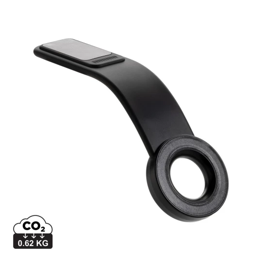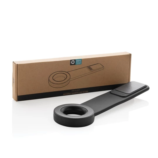 Magnetyczny uchwyt do telefonu, mocowanie do deski rozdzielczej za pomocą mocnej taśmy, wykonany z TPU, ABS i aluminium z recyklingu, całkowita zawartość materiałów z recyklingu obliczona w oparciu o wagę całkowitą przedmiotu: 85%, w pudełku z certyfikatem FSC® mix
