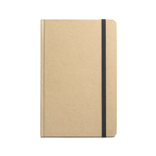 Notes A5 ze 160 stronami w linie (60 g/m²), wykonanych w 100% z papieru z recyklingu, i twardą okładką w 100% z papieru z recyklingu. Zawiera zakładkę z tasiemki oraz gumkę w pasującym kolorze. 137 x 210 mm