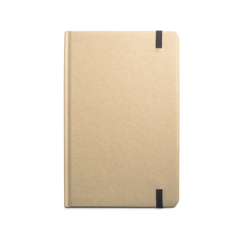 Notes A5 ze 160 stronami w linie (60 g/m²), wykonanych w 100% z papieru z recyklingu, i twardą okładką w 100% z papieru z recyklingu. Zawiera zakładkę z tasiemki oraz gumkę w pasującym kolorze. 137 x 210 mm