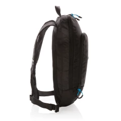 Mały plecak turystyczny, pojemność 7l, wykonany z wytrzymałej tkaniny poliestrowej, doskonale nadaje się do aktywności na świeżym powietrzu, wewnątrz kieszeń na butelkę, plecak posiada otwór do wyprowadzenia rurki nawadniającej, przednia kieszeń na zamek błyskawiczny, zintegrowana osłona przeciwdeszczowa, miękkie, regulowane paski na ramię, nie zawiera PVC, ślad węglowy produktu: 2,11 kg CO2
