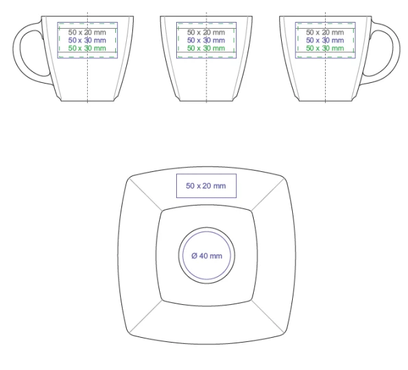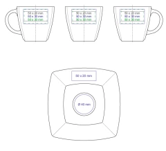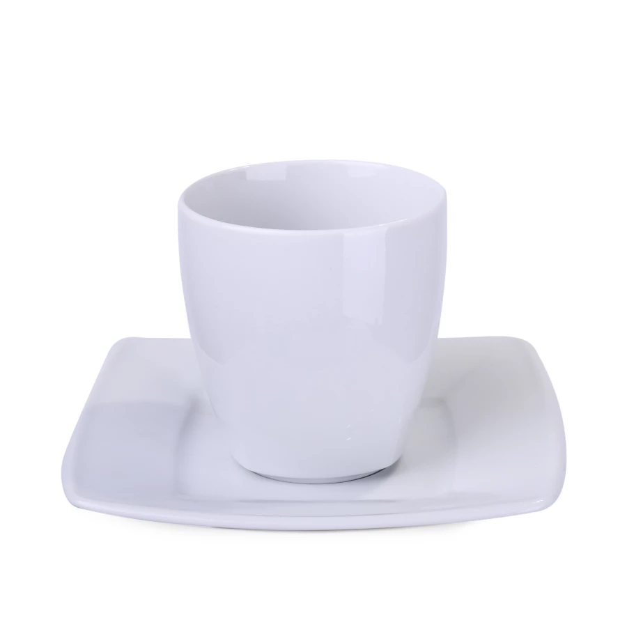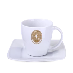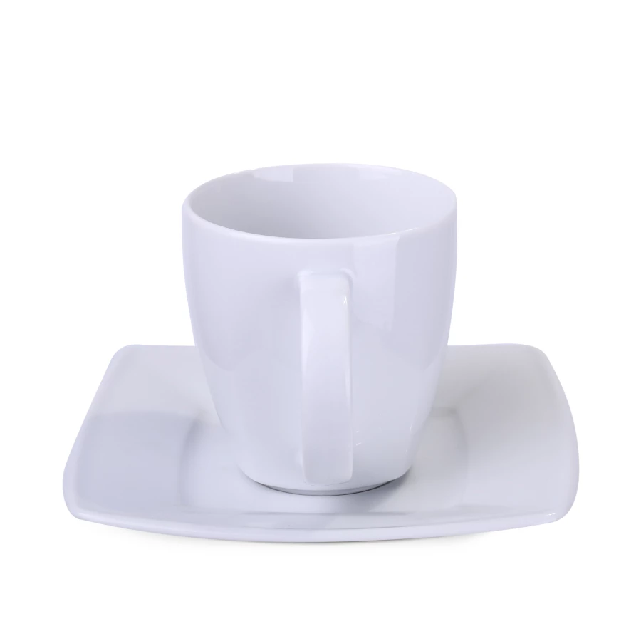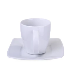Porcelanowy set złożony z eleganckiego kubka oraz dedykowanego talerzyka. Cechą charakterystyczną tego fasonu są delikatne kwadratowe wykończenia widoczne w jego dolnej części.