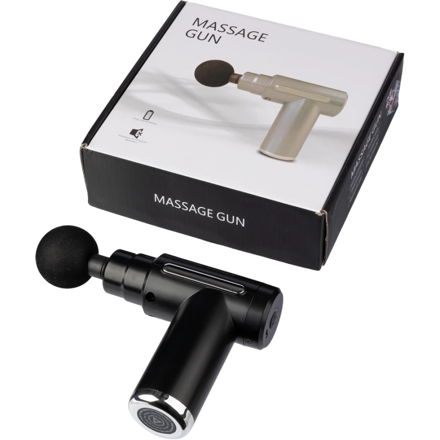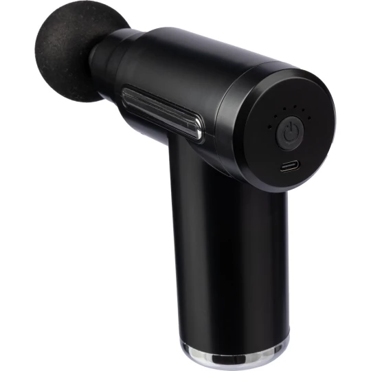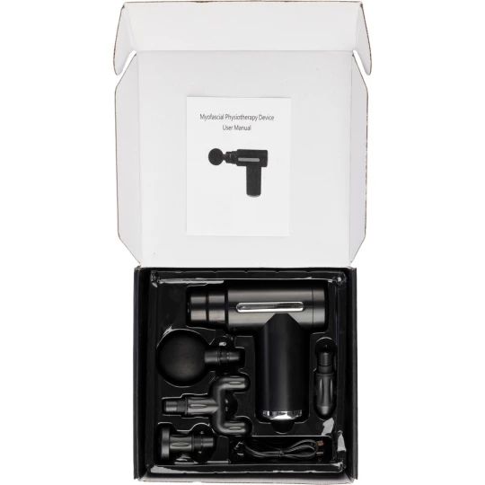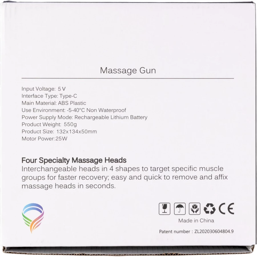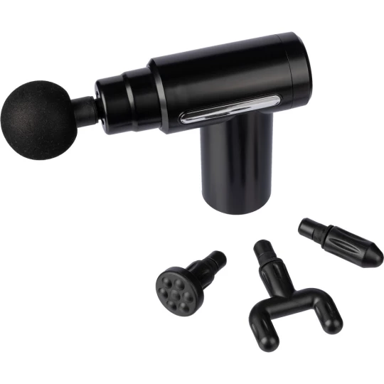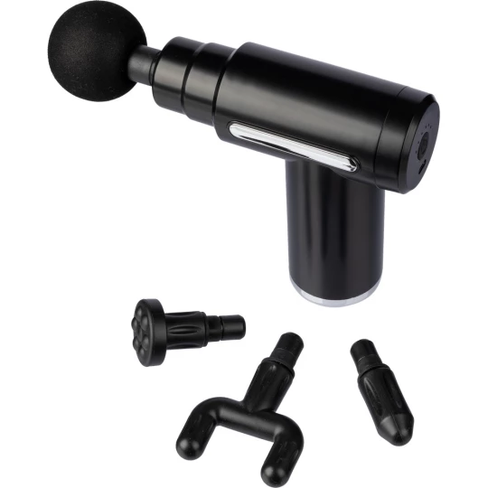 Masażer mięśni z silnikiem szczotkowym (prędkość 1800 - 3200 obr/min) i akumulatorem 1200 mAh, wejście 5V, 6 poziomów intensywności masażu mięśni, pomaga zrelaksować się po stresującym dniu, zawiera 4 końcówki masujące, pudełko podarunkowe w komplecie, produkt wykonany z ABS