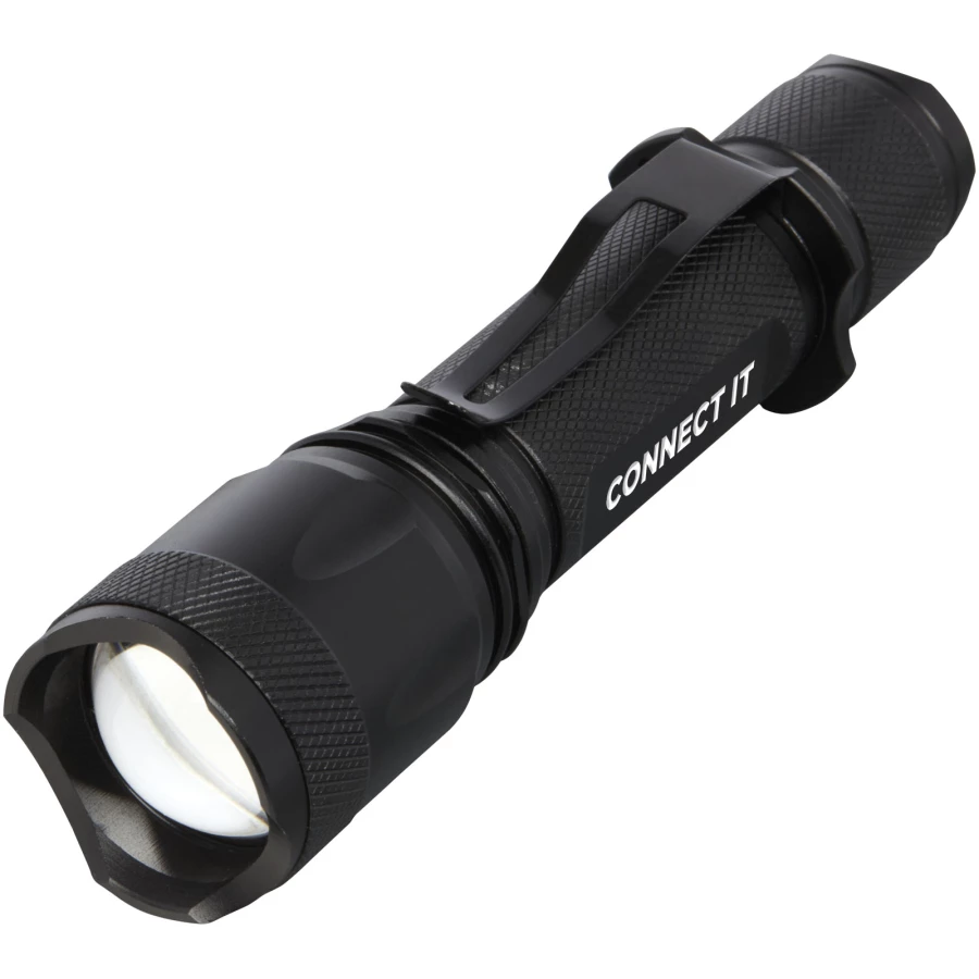 Koniec z problemem wyczerpania baterii dzięki tej ładowalnej aluminiowej latarce taktycznej o dużej mocy. Solidna czarna obudowa ze stopu aluminium oferuje taktyczny wygląd i odporność na uderzenia z 1 metra. Latarka posiada zaczep do paska ułatwiający przenoszenie i jest odporna na zachlapanie wodą dzięki klasie IPX4. Dioda LED o mocy 5W generuje światło o mocy 300 lumenów przez 3 godziny, a zasięg wiązki wynosi 200 metrów i posiada 5 różnych trybów świecenia: wysoki, średni, niski, stroboskop i SOS. Duża moc pochodzi z wbudowanego akumulatora litowego o pojemności 2000 mAh. Latarka ma wymiary 14,5 x 3,4 cm i waży tylko 170 gramów. Dostarczana jest z instrukcją obsługi i zapakowana w pudełko upominkowe z kartonu z recyklingu o wymiarach 17,5 x 6 x 4 cm. Zaleca się grawerowanie laserowe na aluminiowym korpusie.