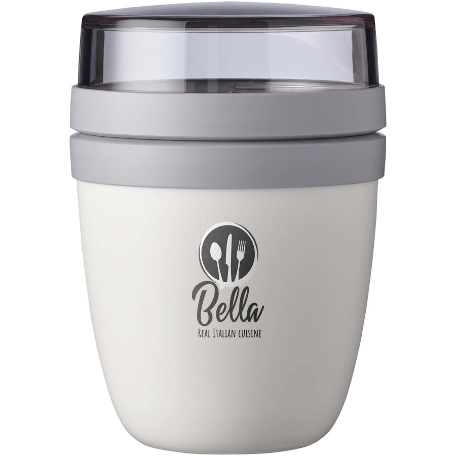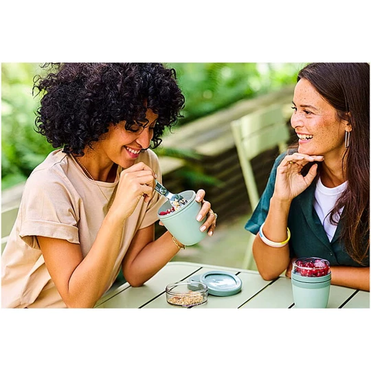 Pojemnik na lunch Ellipse Mini idealnie nadaje się do przechowywania przekąsek, np. jogurtu z musli lub zupy z grzankami. Dzięki dwóm inteligentnym przegródkom w jednym wytrzymałym pojemniku Twoje produkty będą zawsze starannie oddzielone. Jego kompaktowy rozmiar sprawia, że idealnie mieści się w plecaku szkolnym, dzięki czemu można go w niego wygodnie zapakować przekąski na szybki posiłek. Górny przezroczysty pojemnik ma pojemność 120 ml, idealną na około 50 gramów musli lub owoców, a dolny pojemnik ma pojemność 300 ml. Pojemnik jest szczelny i można go myć w zmywarce. Wolne od BPA.