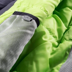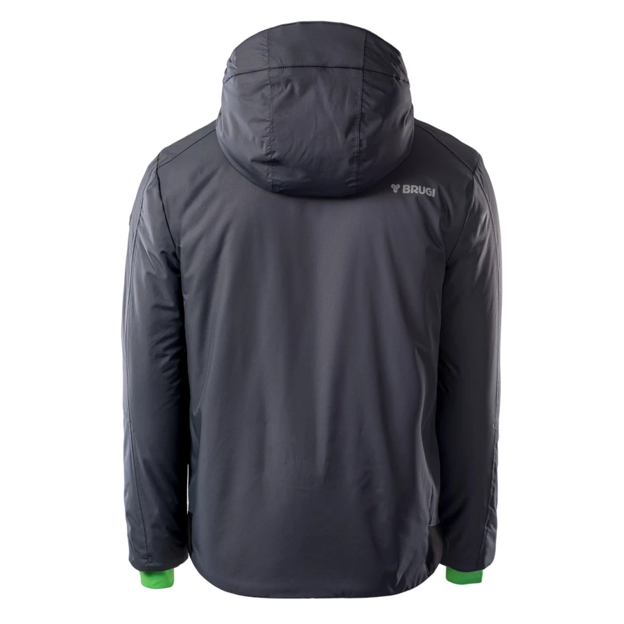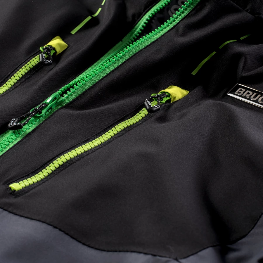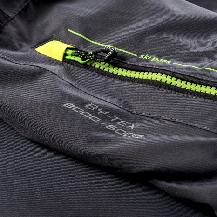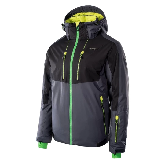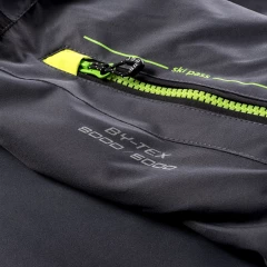 materiał: 100% poliester podszewka: 100% poliester wypełnienie: 100% poliester zwiększona odporność na działanie wody: 8000 mm H2O oddychalność: 5000 g H2O/m2 podklejone szwy fartuch przeciwśnieżny odpinany kaptur kieszeń na skipass dwie kieszenie boczne zapinane na zamek dwie kieszenie na piersi zapinane na zamki elastyczne mankiety z otworami na kciuki