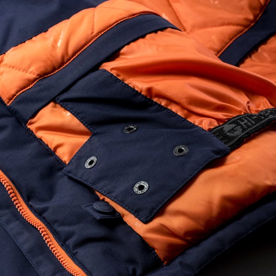 materiał: 100% nylon wypinany i regulowany kaptur wysoki kołnierz wodoszczelne zamki sucha kieszeń wypinany fartuch śnieżny klejone szwy wentylacja pod pachami