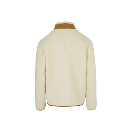 Materiał: 100% poliester z recyklingu Sherpa z wysokim włosiem Regularny krój Zamek błyskawiczny na całej długości Wysoki kołnierz ze stretchem Kieszeń na piersi zapinana na zamek Kieszenie boczne Elastyczne, delikatne ściągacze przy mankietach i u dołu bluzy