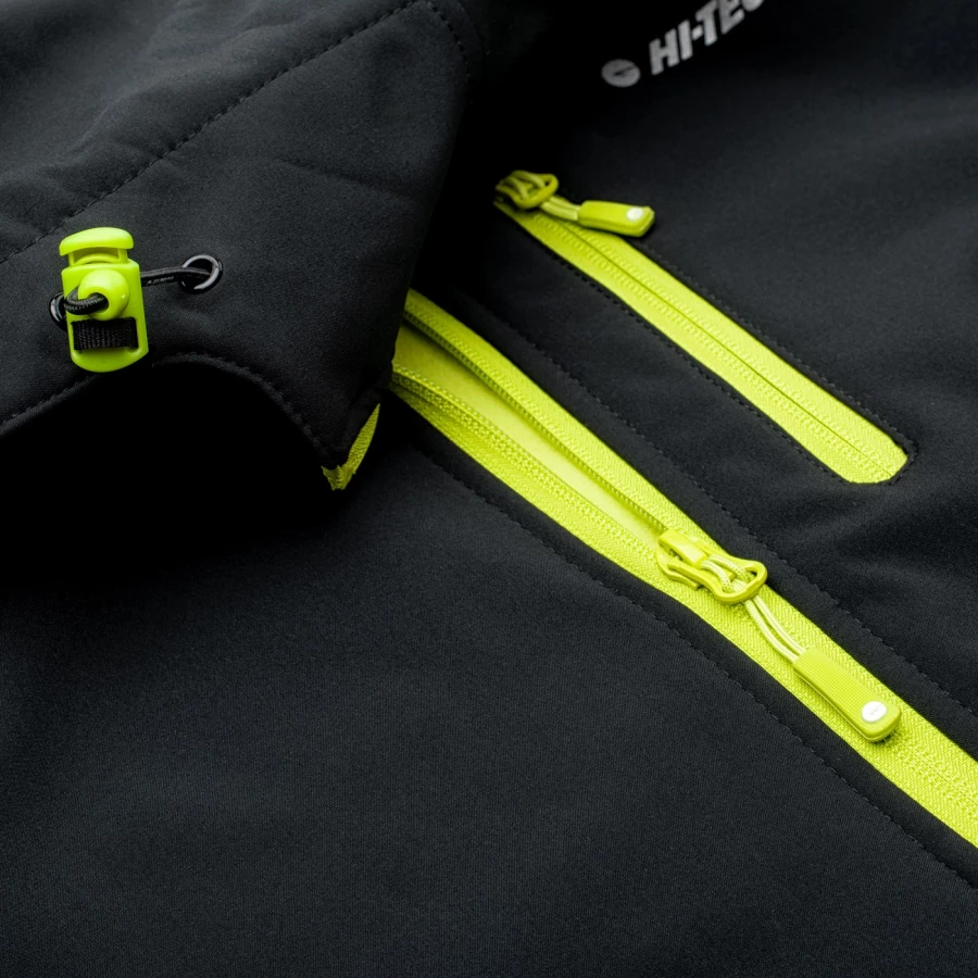 Materiał: Softshell: 94% poliester, 6% elastan; podszycie: 100% poliester; wodoodporność: 8 000 mm H20; oddychalność: 1000 g H2O/m2; wentylacja; polarowe podszycie; głęboki kaptur; boczne kieszenie.