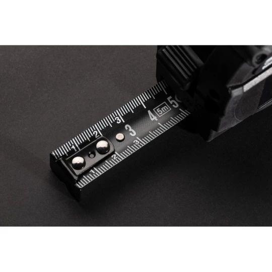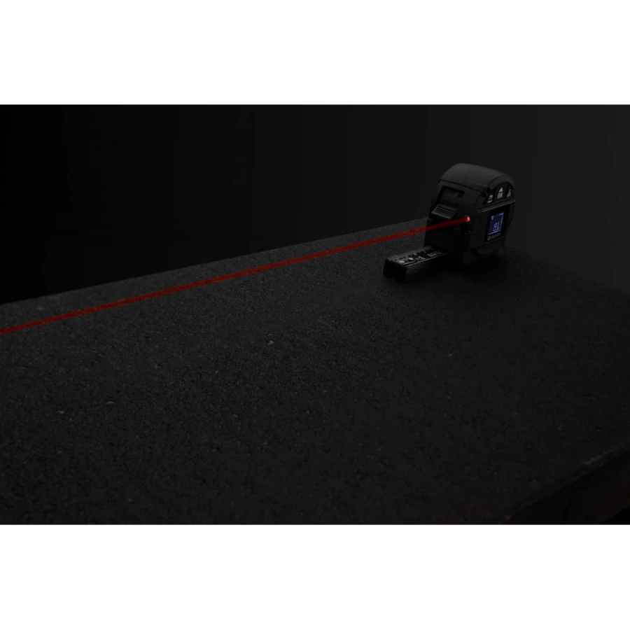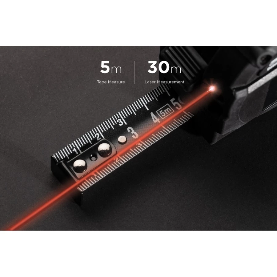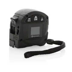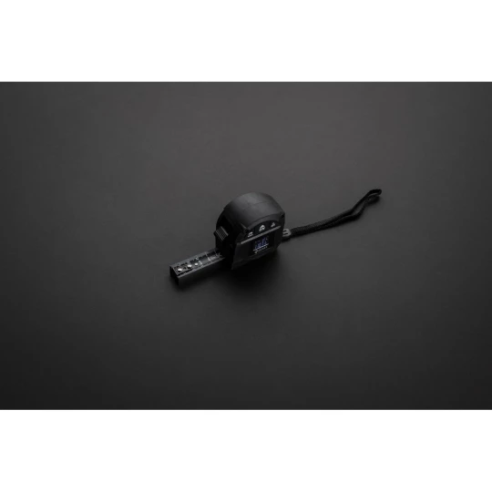 Miara 5 m, przycisk blokady, dalmierz laserowy 30m, wbudowany ekran LCD, czarna, dwustronna taśma wykonana z trwałego włókna węglowego, wbudowany akumulator, w pudełku podarunkowym, ślad węglowy produktu: 2,14 kg CO2