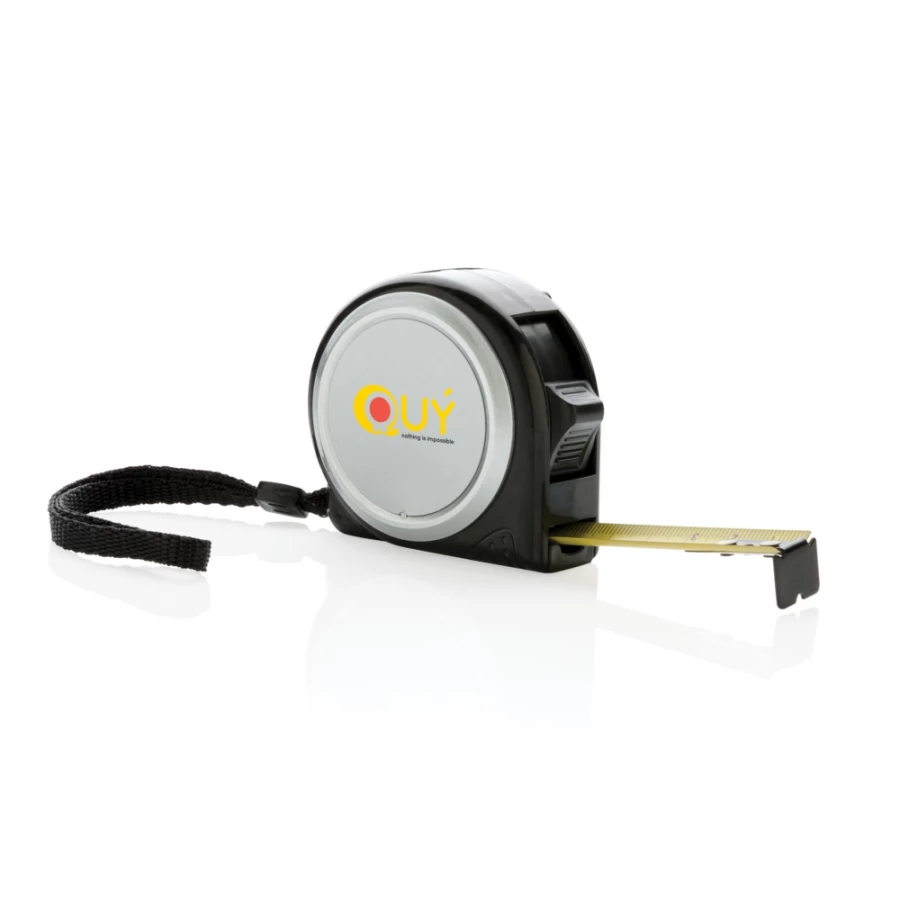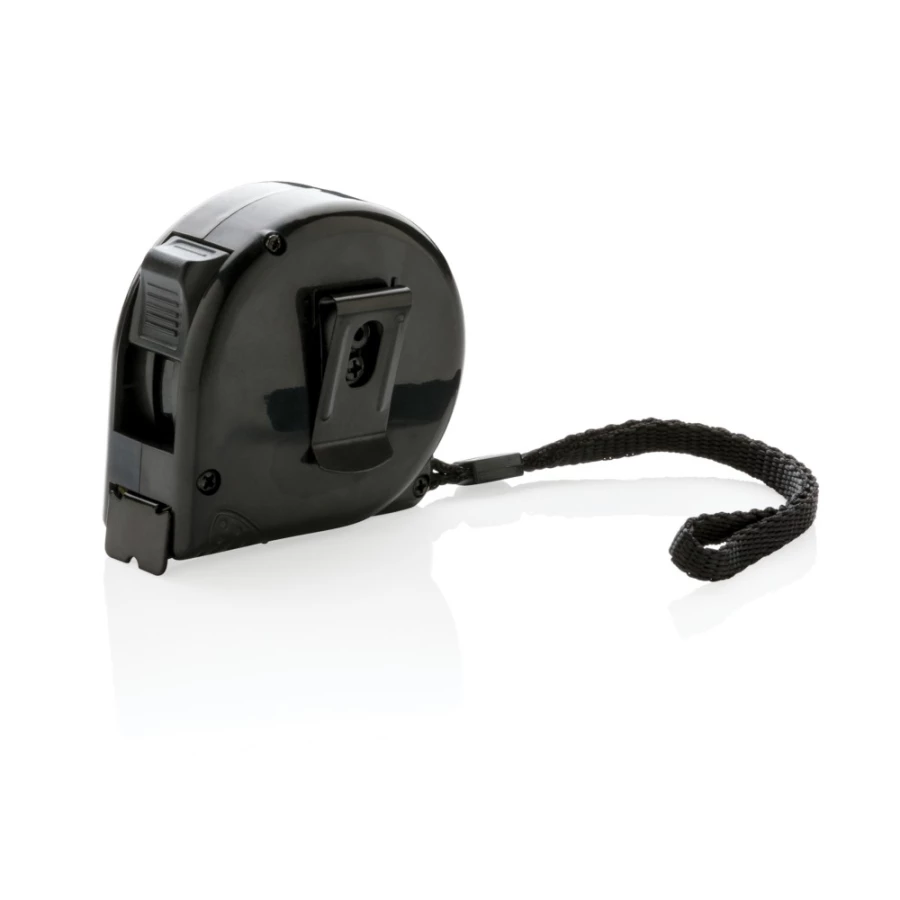 Miara 5 m wykonana z ABS, żółta taśma o szerokości 19 mm z zaczepem, klip do paska i pasek na rękę, ślad węglowy produktu: 0,94 kg CO2