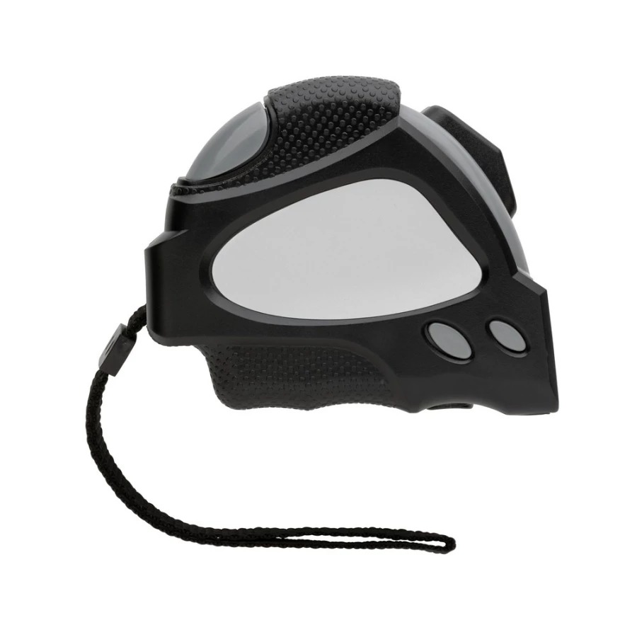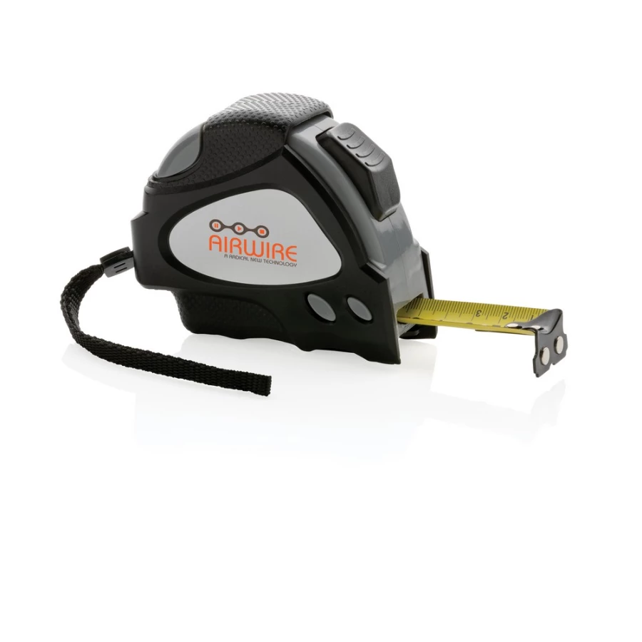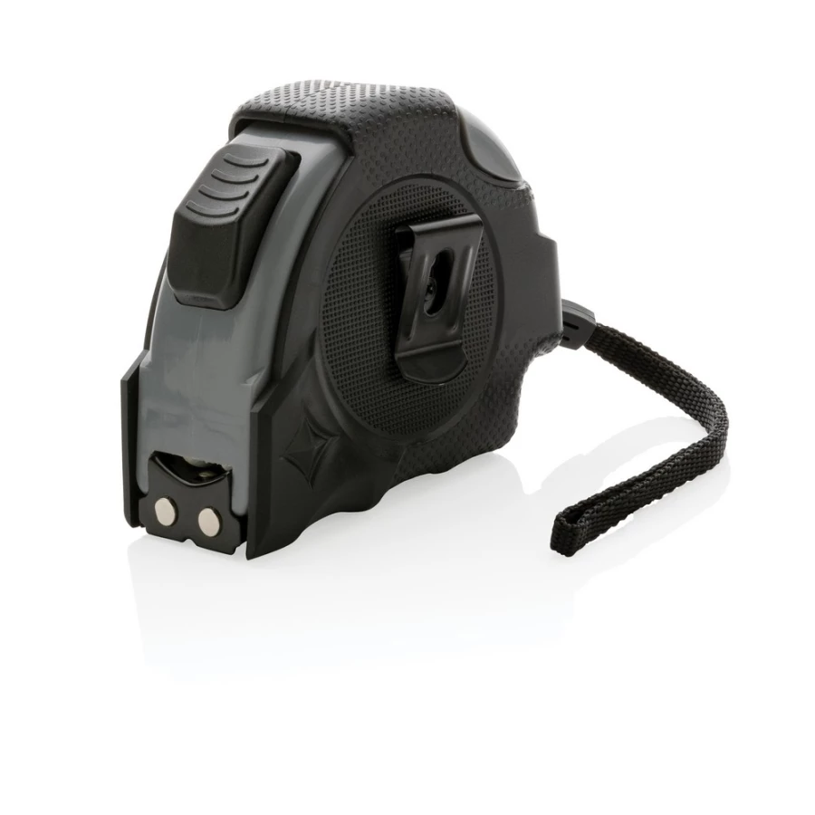 Miara 8 m, taśma o szerokości 25 mm z haczykiem i magnesami, przycisk blokady, wykonana z ABS pochodzącego z recyklingu z certyfikatem RCS (Recycled Claim Standard) który gwarantuje, że wykorzystane materiały pochodzą z recyklingu, całkowita zawartość materiału z recyklingu obliczona w oparciu o wagę całkowitą przedmiotu: 11%, uchwyt z TPR, w pudełku z papieru kraftowego