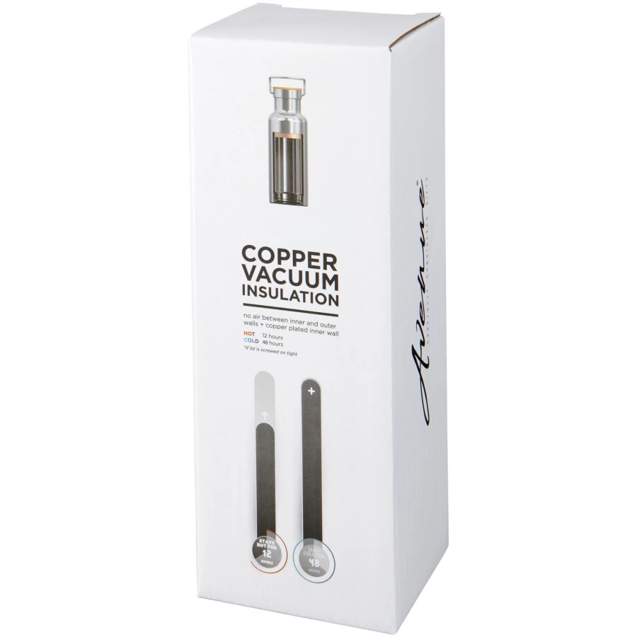 Dwuwarstwowa konstrukcja ze stali nierdzewnej z izolacją miedzianą zapewnia utrzymanie niskiej temperatury napoju przez 48 godzin i wysokiej przez co najmniej 12 godzin. Konstrukcja zapobiega również kondensacji na zewnątrz butelki. Zakręcana pokrywa z detalami drewnianymi. Modna i trwała powłoka proszkowa. Pojemność 480ml. Zapakowany w pudełko upominkowe Avenue.