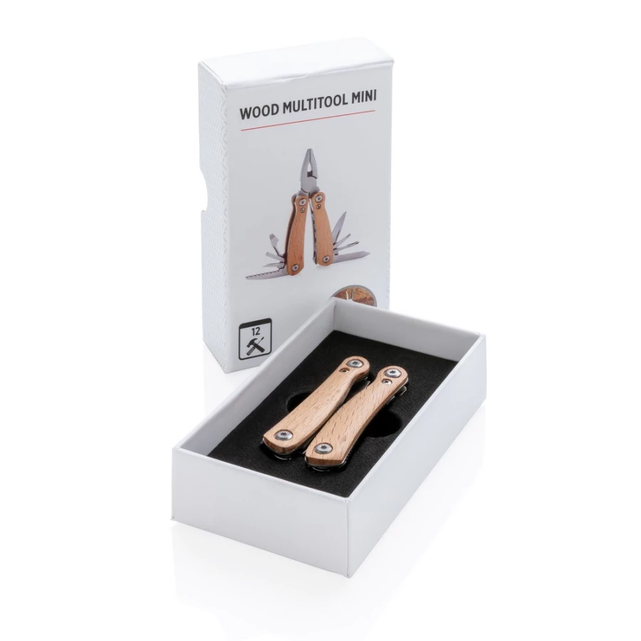Trwałe i kompaktowe narzędzie wielofunkcyjne, wykonane z wysokiej jakości stali nierdzewnej, uchwyt z drewna bukowego, 12 funkcji: długie szczypce, kombinerki, przecinak do kabli i drutu, ostrze ząbkowane, mały nóż, średni śrubokręt płaski, otwieracz do butelek, duży śrubokręt płaski, nóż, mały śrubokręt płaski, śrubokręt krzyżakowy, pilnik i skrobak, w ozdobnym pudełku, ślad węglowy produktu: 0,56 kg CO2
