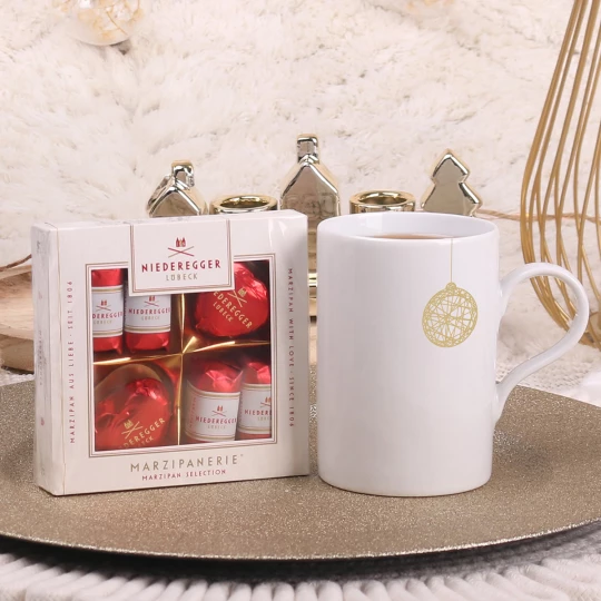 Klasyczny kubek Tango, wykonany z europejskiej porcelany oraz starannie wyselekcjonowane czekoladki Niederegger 75g. Zestaw w dedykowanym opakowaniu.