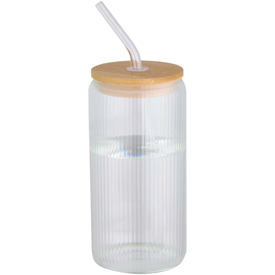 Słoik ze szkła borokrzemowego ze szklaną słomką i bambusową pokrywką. Słoik ma unikalną żebrowaną konstrukcję wewnątrz i gładką powierzchnię zewnętrzną, idealną do nadruku logo. Bambus, z którego wykonano pokrywkę, pochodzi ze zrównoważonych upraw, prowadzonych z poszanowaniem środowiska naturalnego i w duchu odpowiedzialności społecznej. Dostarczany w pudełku upominkowym wykonanym z kartonu z recyklingu. Pojemność: 650 ml.