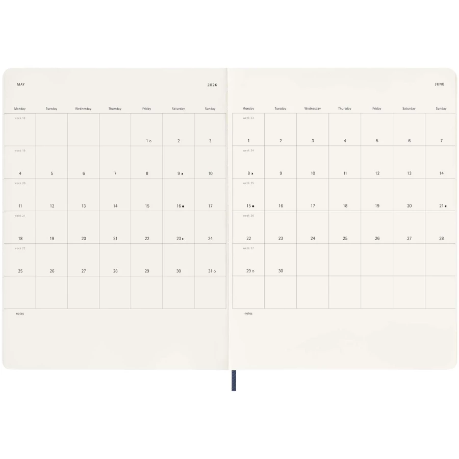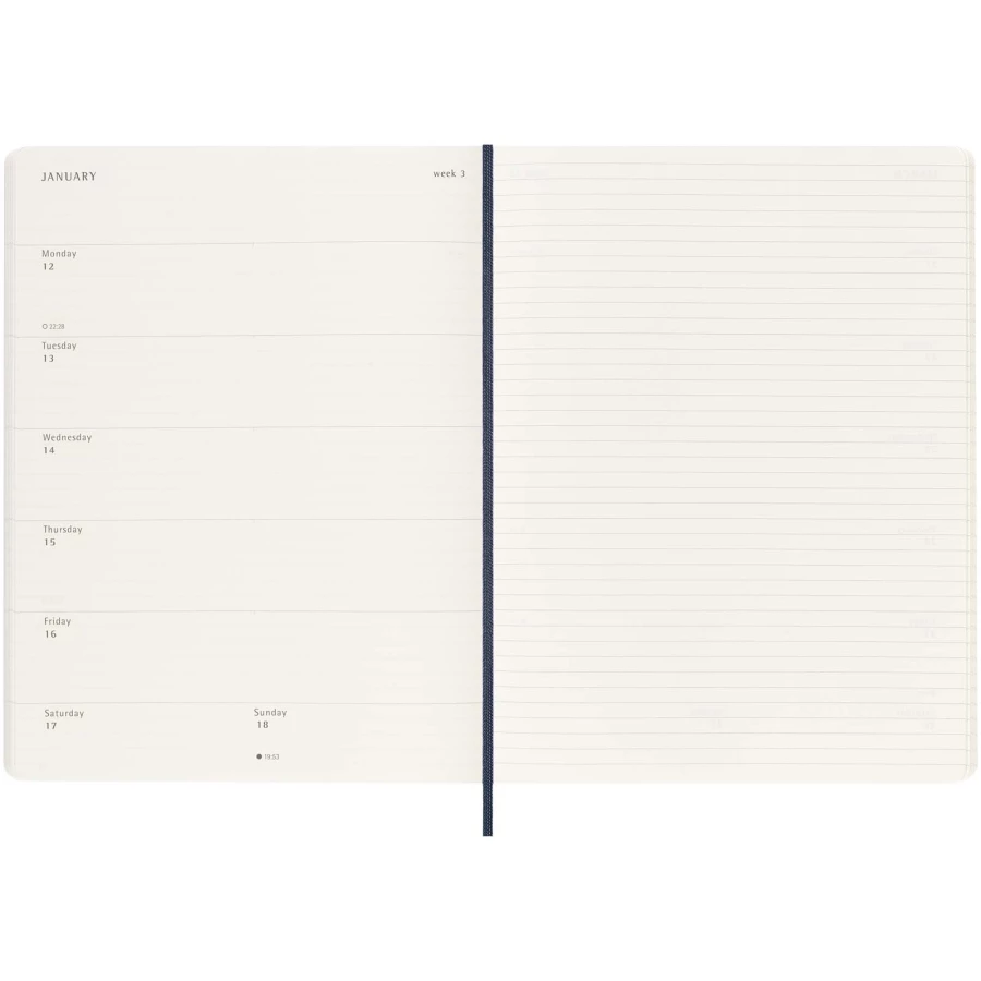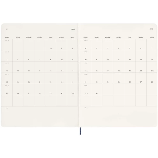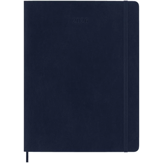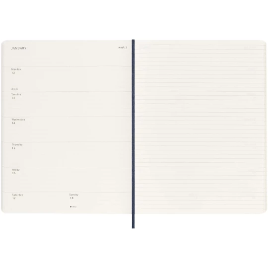 12-miesięczny kalendarz tygodniowy Moleskine XL w miękkiej oprawie, obejmujący okres od stycznia do grudnia 2026 r., pokazuje w skrócie cały tydzień, zawierając jednocześnie przeglądowe strony roczne i miesięczne zapewniające lepszy podgląd roku oraz strony na planowanie podróży, zapisywanie pomysłów i celów. Dni każdego tygodnia są pokazane po jednej stronie obok strony w linie z miejscem na zadania i notatki. Zawiera bezkwasowy papier w kolorze kości słoniowej, czarne elastyczne zamknięcie, wstążkę do zaznaczania stron, kolorową rozszerzalną kieszeń wewnętrzną i naklejki do personalizacji, a także naklejki z rokiem na grzbiecie.