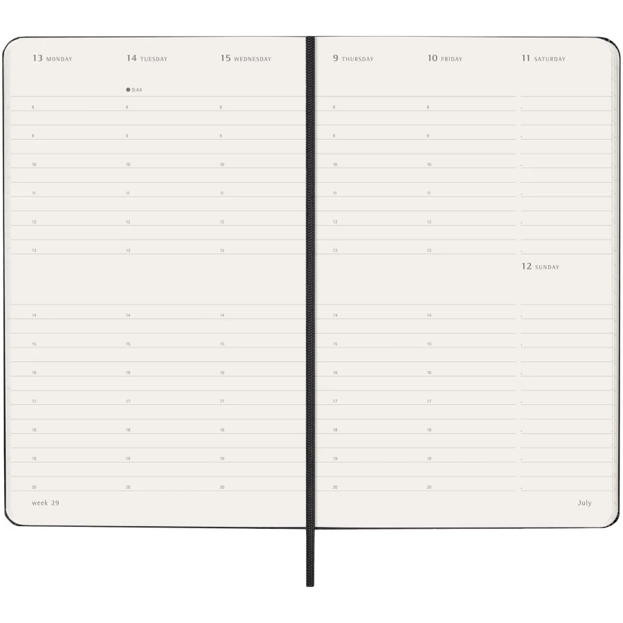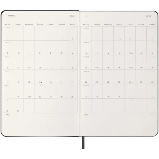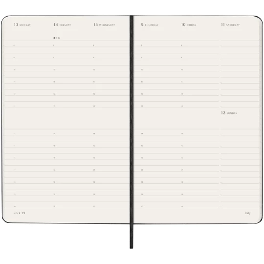 Tygodniowy, pionowy kalendarz Moleskine L w twardej okładce obejmujący okres od stycznia do grudnia 2026 r. Ten popularny kalendarz jest sformatowany w pionie, aby pokazać każdy tydzień na dwóch stronach, a dni na górze strony, idealnie nadaje się dla wszystkich, którzy chcą mieć przegląd całego tygodnia. Zawiera bezkwasowy papier w kolorze kości słoniowej, czarne elastyczne zamknięcie, wstążkę do zaznaczania stron, kolorową rozszerzalną kieszeń wewnętrzną i naklejki do personalizacji, a także naklejki z rokiem na grzbiecie.
