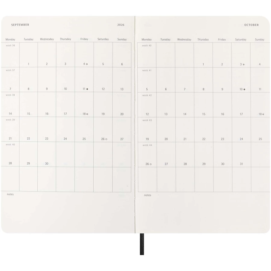 Zaplanuj każdy dzień w najdrobniejszych szczegółach za pomocą 12-miesięcznego kalendarza Moleskine w miękkiej oprawie. Ten kalendarz obejmujący okres od stycznia do grudnia 2026 r., jest sformatowany w taki sposób, aby na każdej stronie znajdował się cały dzień, co zapewnia mnóstwo miejsca na zapisywanie wydarzeń, spotkań, zadań do wykonania, przypomnień i planów. W ciągu roku staje się on fizycznym zapisem wszystkiego, co udało Ci się osiągnąć, dzień po dniu. Zawiera bezkwasowy papier w kolorze kości słoniowej, czarne elastyczne zamknięcie, wstążkę do zaznaczania stron, kolorową rozszerzalną kieszeń wewnętrzną i naklejki do personalizacji, a także naklejki z rokiem na grzbiecie.